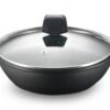 Royalty Line modern aluminum nonstick ceramic frying pan is manufactured without harmful substances such as PFOA, PFOS, PFAS, APEO, LEAD and CADMIUM, etc. The heat-resistant handles and clear shatter-resistant glass lid ensure that you can keep the food in the pan while cooking can keep an eye on.