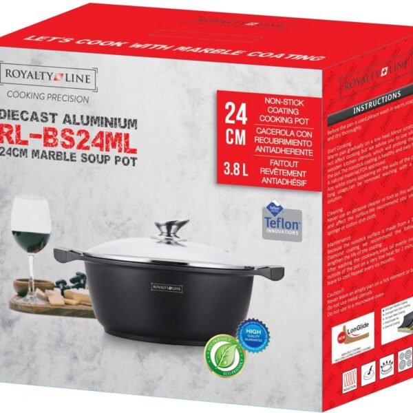 Royalty Line modern aluminum nonstick ceramic frying pan is manufactured without harmful substances such as PFOA, PFOS, PFAS, APEO, LEAD and CADMIUM, etc. The heat-resistant handles and clear shatter-resistant glass lid ensure that you can keep the food in the pan while cooking can keep an eye on.