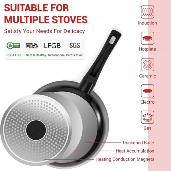 The PTFE/PFOA/PFOS-free nonstick cooking pots feature a durable nonstick coating for easy food release, cleaning and healthy cooking with a heat-resistant exterior paint that can withstand high temperatures. These pans and frying pans are safe for use on gas, electric, ceramic and induction.