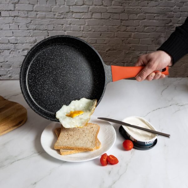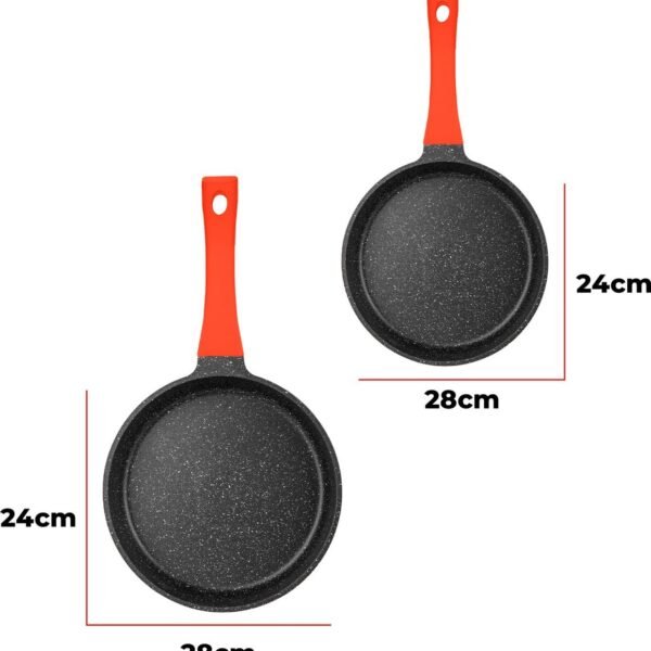 The durable pans are manufactured with Swiss precision and have a high-quality non-stick coating with a marble coating and a durable aluminum housing. Due to the very hard marble coating, you do not have to use butter or oil while cooking, because the food does not stick to the pan. Moreover, this coating is free from the toxic substance PFOA. This makes it very easy to prepare healthy, tasty and lean meals.