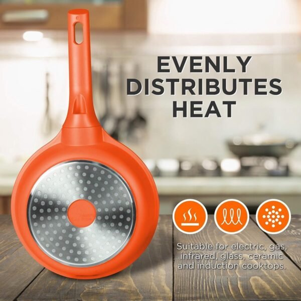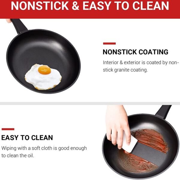 The PTFE/PFOA/PFOS-free nonstick cooking pots feature a durable nonstick coating for easy food release, cleaning and healthy cooking with a heat-resistant exterior paint that can withstand high temperatures. These pans and frying pans are safe for use on gas, electric, ceramic and induction.