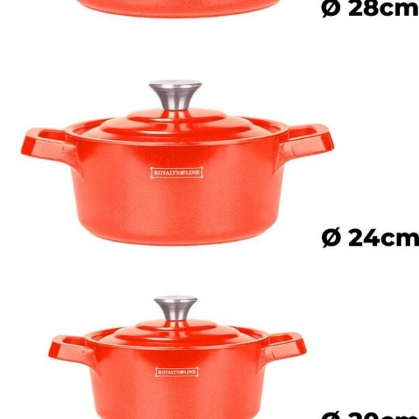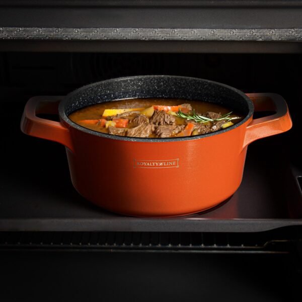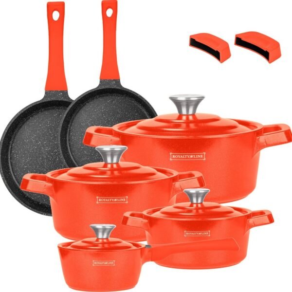 Royalty Line induction cookware set has a 3-layer non-stick coating, which keeps it 100% free from exposure to harmful substances. And it is heavy and sturdy, for long-term use. The pan set has cool-touch ergonomic and heat-resistant handles that ensure comfortable and safe cooking.