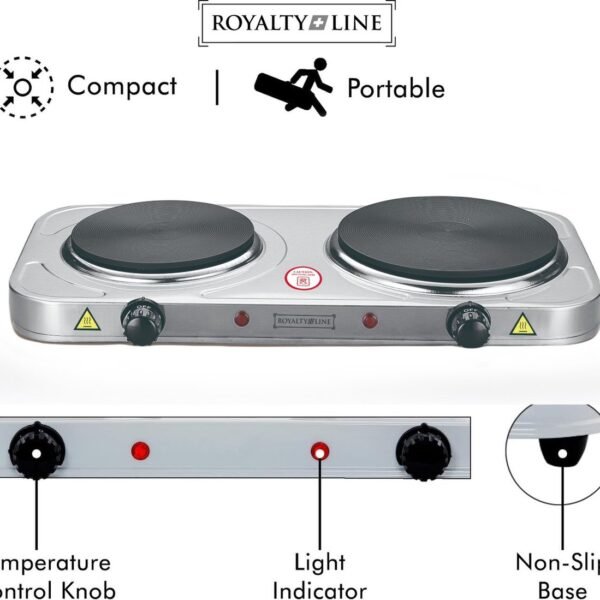Royalty Line 2500W Portable Double Electric Hob. Set the hob to the highest setting (position 5) for 3 to 5 minutes before using it for the first time.