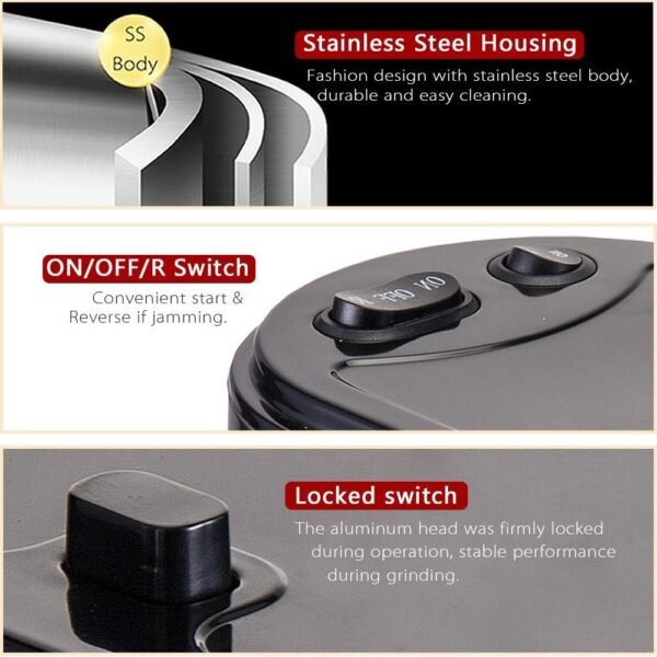 ON/OFF/REV function via button control, with safety buckle, with overheating protection function (with temperature-sensitive automatic power off), stainless steel panel without fingerprints, anti-slip foot sole (ABS Injection housing+anti-fingerprint S/S panel).