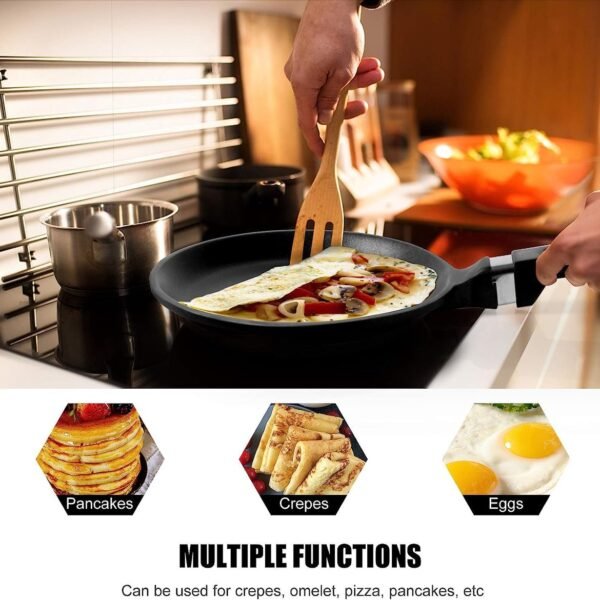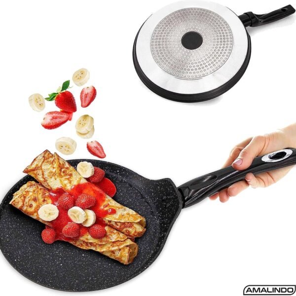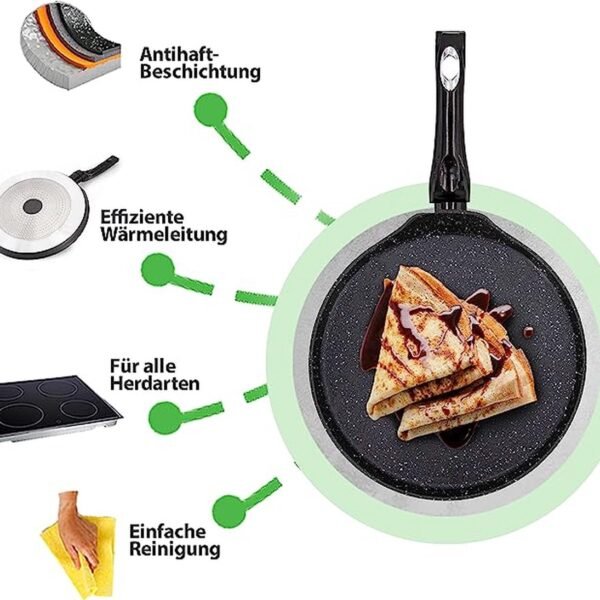 Thanks to its special, flat shape, the Royalty Line pancake pan is the perfect pan for preparing wafer-thin crepes or delicious pancakes. Thick cast aluminum ensures exceptionally even results, while the robust and durable 3-layer non-stick coating not only effectively prevents pancakes from sticking, but also ensures effortless cleaning. The result is crispy, golden crêpes and wonderfully fluffy pancakes. The crepe pan is rounded off with a practical batter divider, a handle for safe and comfortable use.