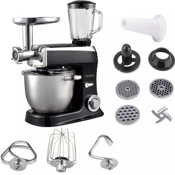 Planetary Mixer 3 in 1 With Blender, Meat Grinder, Whisk, Dough Hook, Mixing Hook – 2100W – 1.5 L Glass Jug – 7.5 Liters stainless Steel Bowl – Black – Royalty Line