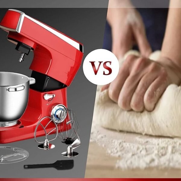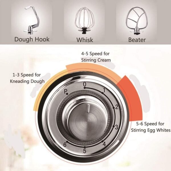 The tilt head design helps the stand mixer to lift its head smoothly, while effectively preventing you from being injured by accidental touching. The tilt lock of the mixer can lock the head when it is lifted to ensure that it does not fall heavily, the inner spring allows the head to go down slowly and no need to apply force to lift it. It also provides access to installing or removing the bowl and accessories.