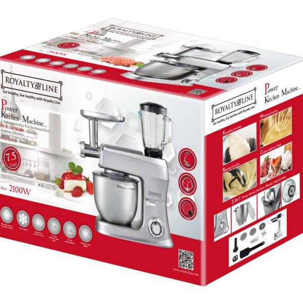 The food processor is equipped with a 2100W high-quality pure copper motor with a low noise level <75dB., which is powerful enough to drive the motor so that the ingredients in the bowl can be mixed evenly. 7.5L Stainless Steel Bowl The super large bowl in your kitchen, meets all your needs. Made of stainless steel so you can easily make dough in larger quantities without wasting time. The mixing action rotates the beaters around the included 7.5 Liter stainless steel bowl for even and completely hands-free mixing. Meat grinder Equipped with a metal inner core, it is easy to grind meat, can make meat of all kinds of thickness, and make delicious sausages and meat sauces at home. 1.5 Liter Blender With a large capacity of 1.5 Liters, the three-dimensional blending blade with strong force is used to quickly produce juice and easily squeeze oranges and other fruits and make delicious smoothies. Splash protection The splash guard can prevent food from spilling. And the transparent lid allows you to observe the food situation during mixing. Includes everything you need In addition to the stainless steel bowl, the food processor comes with a splash guard, kneading hook, whisk and mixing arm. 7 speed controls 7 speed settings for different occasions with pulse function. Go from slow stirring to fast mixing with precise control at any speed. The slow first speed is ideal for kneading bread and reducing spatter when adding dry ingredients to wet ingredients. The high speed is ideal for whipping cream or meringue. The device has: 7.5L Stainless Steel Mixing Bowl. The metal parts are not dishwasher safe Glass jug blender 1.5L Stainless steel blender blades 7 speeds + pulse Transparent splash guard Security locking system Non-slip bottom Low noise level ≤75dB The same rotating mixing action as other leading brands Specifications Powerful Power: 2100W Power supply: 220-240V ~ 50/60Hz About Royalty Line Since Royalty Line was founded, Royalty Line has been bringing concepts and designs for kitchen and household products to the global market. Royalty Line aims to offer the easiest products in terms of use, sustainability and innovation. This makes Royalty Line a strong brand in the competitive market.