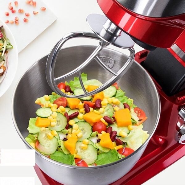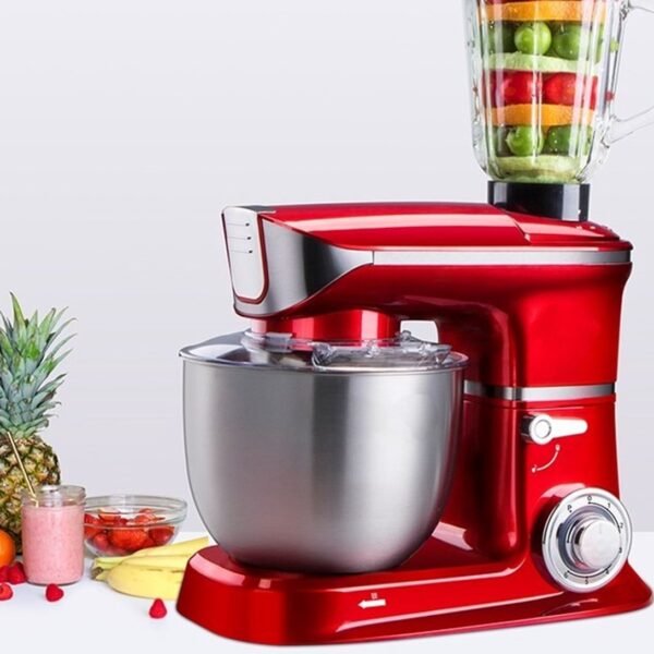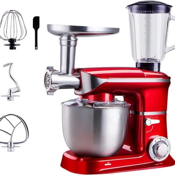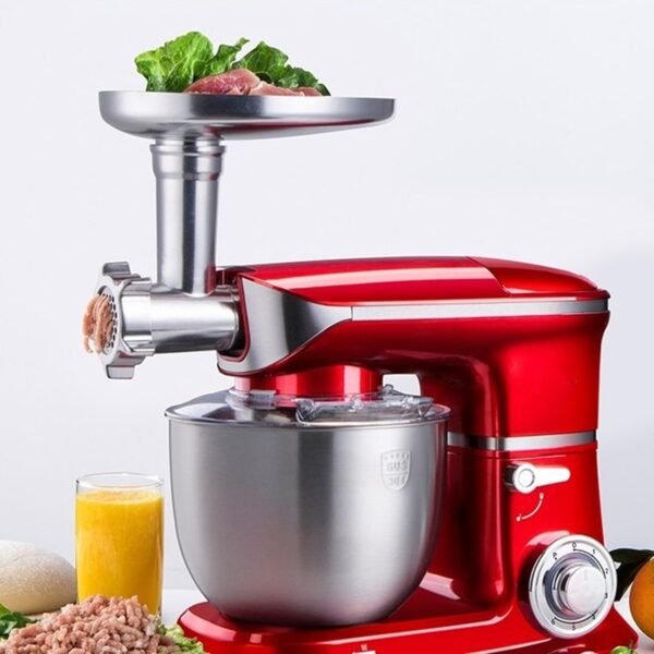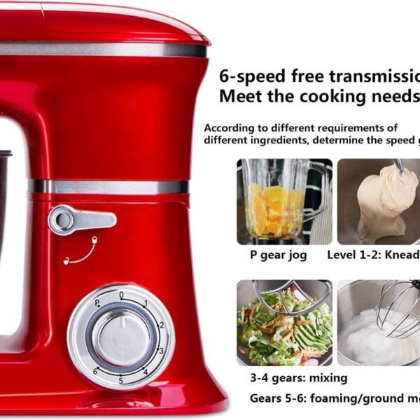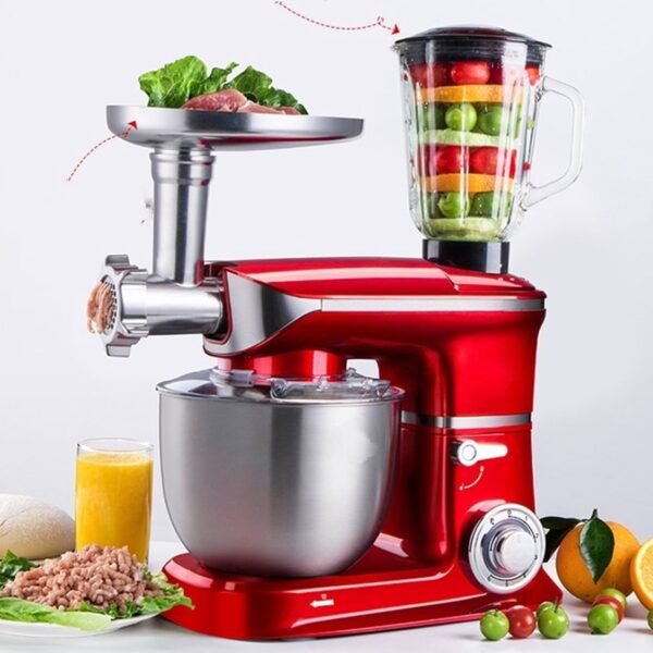 The food processor is equipped with a 1900W high-quality pure copper motor with a low noise level <75dB., which is powerful enough to drive the motor so that the ingredients in the bowl can be mixed evenly. 6.5L Stainless Steel Bowl The super large bowl in your kitchen, meets all your needs. Made of stainless steel so you can easily make dough in larger quantities without wasting time. The mixing action rotates the beaters around the included 6.5 Liter stainless steel bowl for even and completely hands-free mixing. Meat grinder Equipped with a metal inner core, it is easy to grind meat, can make meat of all kinds of thickness, and make delicious sausages and meat sauces at home. 1.5 Liter Blender With a large capacity of 1.5 Liters, the three-dimensional blending blade with strong force is used to quickly produce juice and easily squeeze oranges and other fruits and make delicious smoothies. Splash protection The splash guard can prevent food from spilling. And the transparent lid allows you to observe the food situation during mixing. Includes everything you need In addition to the stainless steel bowl, the food processor comes with a splash guard, kneading hook, whisk and mixing arm. 7 speed controls + LED power indicator 7 speed settings for different occasions with pulse function. Go from slow stirring to fast mixing with precise control at any speed. The slow first speed is ideal for kneading bread and reducing spatter when adding dry ingredients to wet ingredients. The high speed is ideal for whipping cream or meringue. The mixer has a blue LED light as a power indicator. The device has: 6.5L Stainless Steel Mixing Bowl. The metal parts are not dishwasher safe 3 Removable components: Whisk, Dough Hook and Mixing Arm Glass jug blender 1.5L Stainless steel blender blades 6 speeds + pulse Transparent splash guard LED indicator light Security locking system Non-slip bottom Low noise level ≤75dB The same rotating mixing action as other leading brands Product Dimensions: L 39 x H 36 x W 22 CM Available in: Black, Silver and Red Specifications Powerful Power: 1900W Power supply: 220-240V ~ 50/60Hz About Royalty Line Since Royalty Line was founded, Royalty Line has been bringing concepts and designs for kitchen and household products to the global market. Royalty Line aims to offer the easiest products in terms of use, sustainability and innovation. This makes Royalty Line a strong brand in the competitive market.
