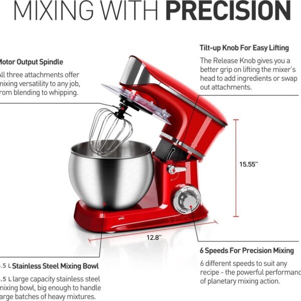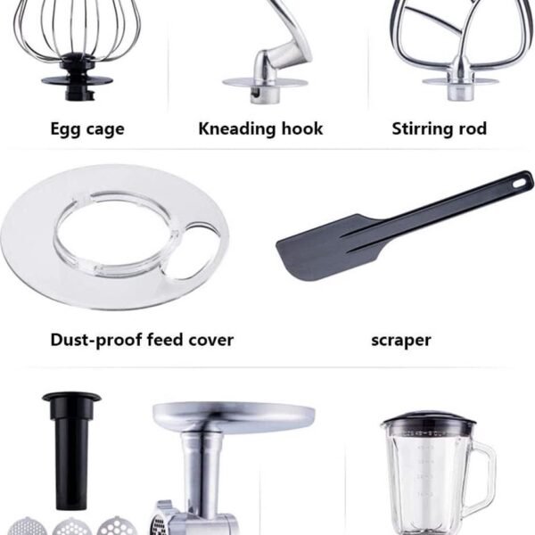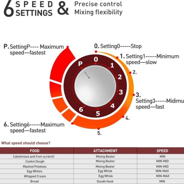The tilt head design helps the stand mixer to lift its head smoothly, while effectively preventing you from being injured by accidental touching. The tilt lock of the mixer can lock the head when it is lifted to ensure that it does not fall heavily, the inner spring allows the head to go down slowly and no need to apply force to lift it. It also provides access to installing or removing the bowl and accessories.