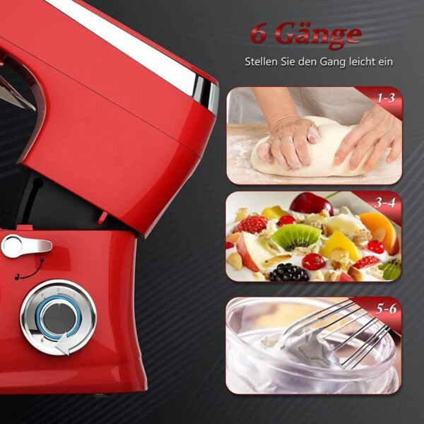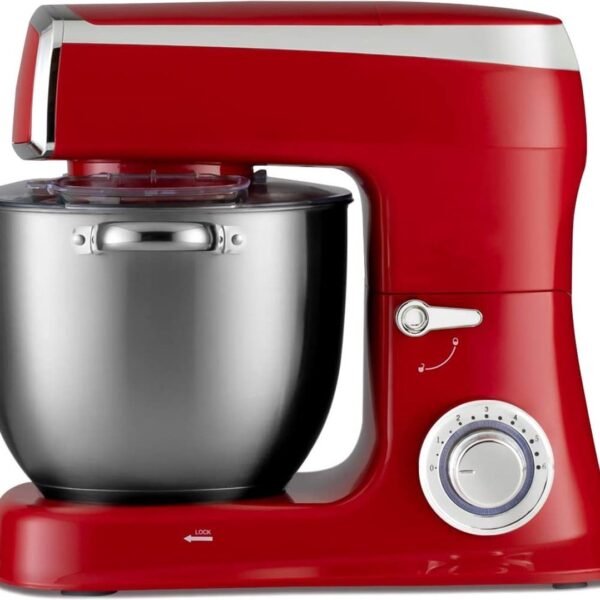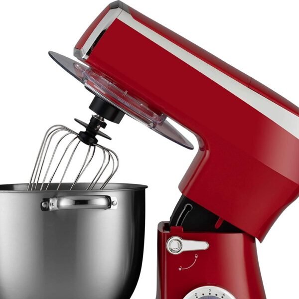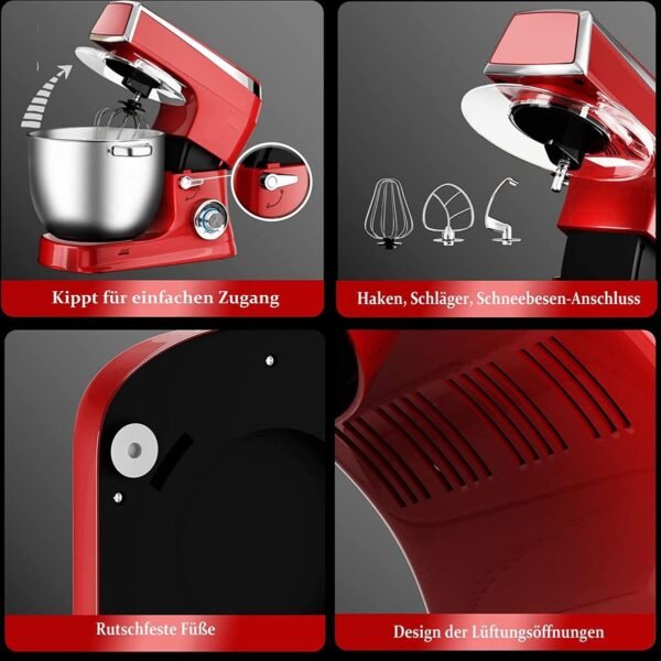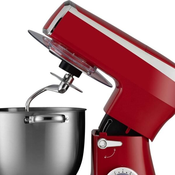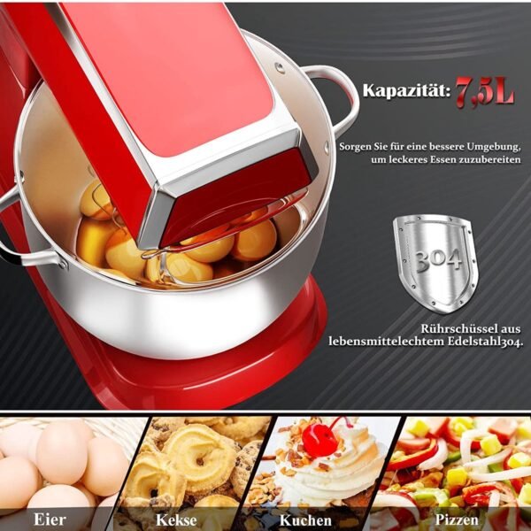 In addition to the stainless steel bowl, the kitchen machine comes with a splash guard, kneading hook, whisk and mixing arm. 7.5 Liter bowl provides enough capacity for your family.