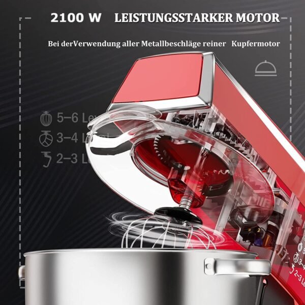 The mixing action rotates the beaters around the included 7.5 liter stainless steel bowl for even and completely hands-free mixing. This tool is designed to simulate perfect culinary movements, ensuring maximum stirring of all food, including the bottom and edges. It helps to make the kneading more even and the food finer.
