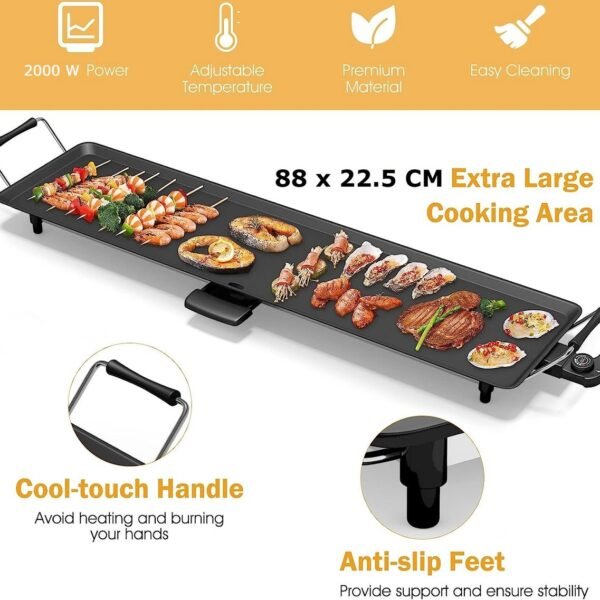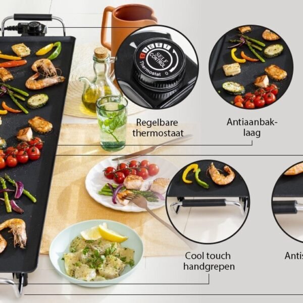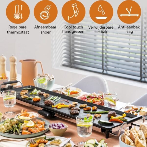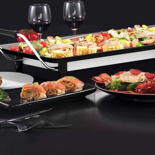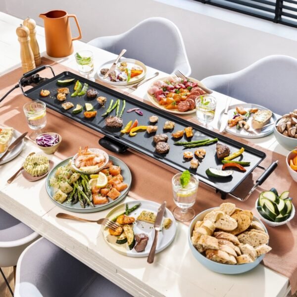 With a Teppanyaki Hot Plate at home you can make all the classic dishes, such as Teppanyaki chicken, salmon, beef, vegetables and fried rice. You can use your table grill for a big breakfast, burgers for lunch, fish for dinner, pancakes and Welsh cakes – you can even make Teppanyaki Popcorn with it! With an adjustable thermostat and 5 heat settings, you have complete control over what you cook and how.