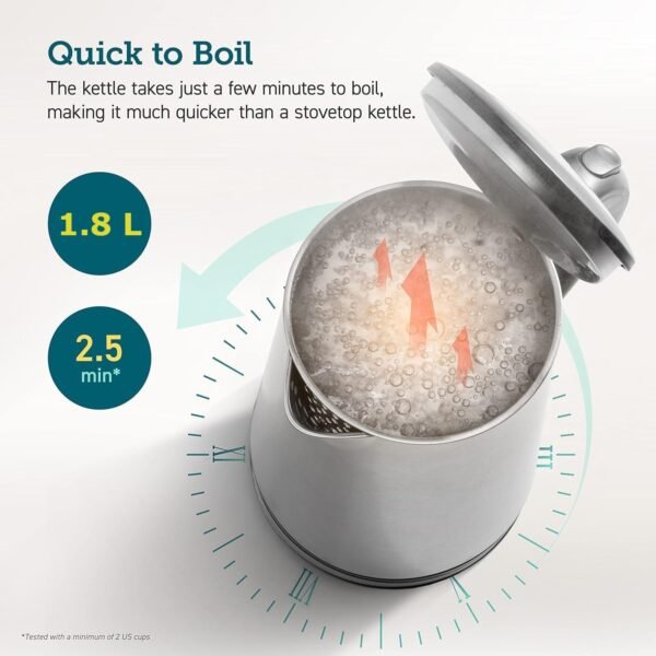 • Automatically shuts off when water boils and has boil-dry protection to prevent scorching when water is running low
